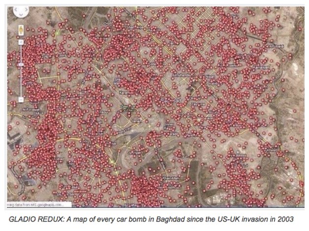 Un mapa de cada coche bomba en Bagdad desde la invasión de Estados Unidos y Reino Unido en 2003 (Fuente: Twitter )