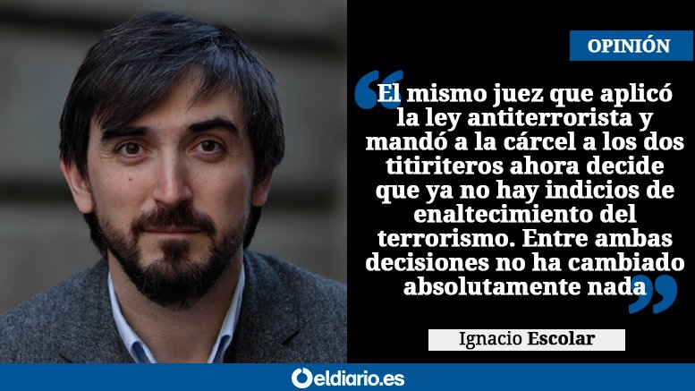 3. El mismo juez que aplicó la ley antiterrorista y mandó a la cárcel sin fianza a los dos titiriteros ahora decide que ya no hay indicios de enaltecimiento del terrorismo. Entre ambas decisiones no ha cambiado absolutamente nada en este proceso judicial: no hay una sola prueba nueva ni ninguna novedad en la investigación que justifique por qué antes eran peligrosos terroristas y hoy ya no lo son.