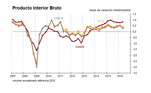 Los datos de la economía española son mucho mejores que los referidos al entorno europeo pese a que no tenemos Gobierno desde hace meses: la Unión Europea (UE-28) sólo creció un 0,4% durante este trimestre (una décima menos que el trimestre anterior); mientras que la Eurozona creció aún menos: un 0,3% (tres décimas menos que el trimestre anterior).