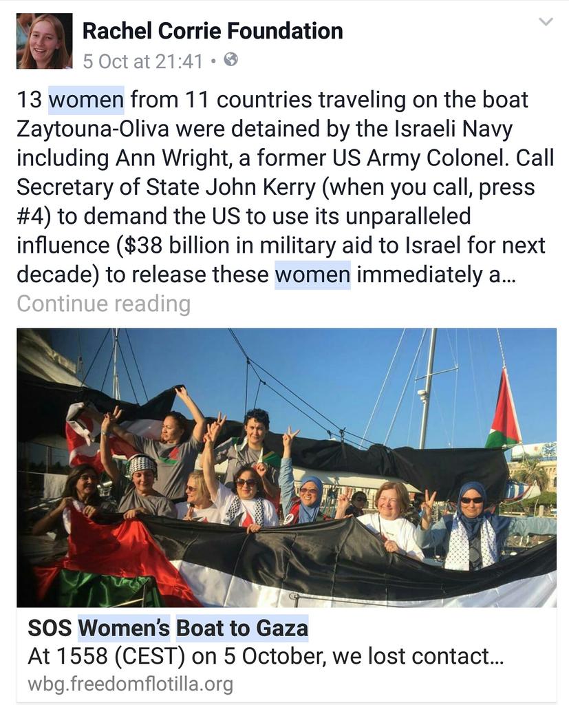 Según la web Middle East Monitor, el ejército de Israel ha abordado al Zaytouna y ha exigido a la capitana, la coronel Ann Wright de la armada estadounidense, que dé la vuelta o las 13 activistas, entre las que se encuentra la española Sandra Barrilaro, serán detenidas.